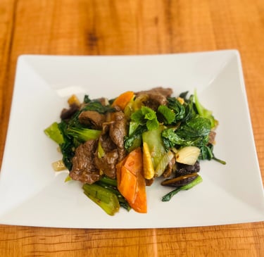 32. TAUSIE NGAU” ossenhaas met zwarte bonensaus.............................€19.50